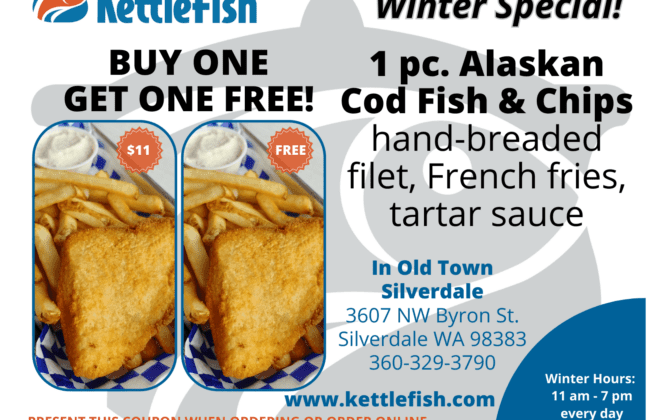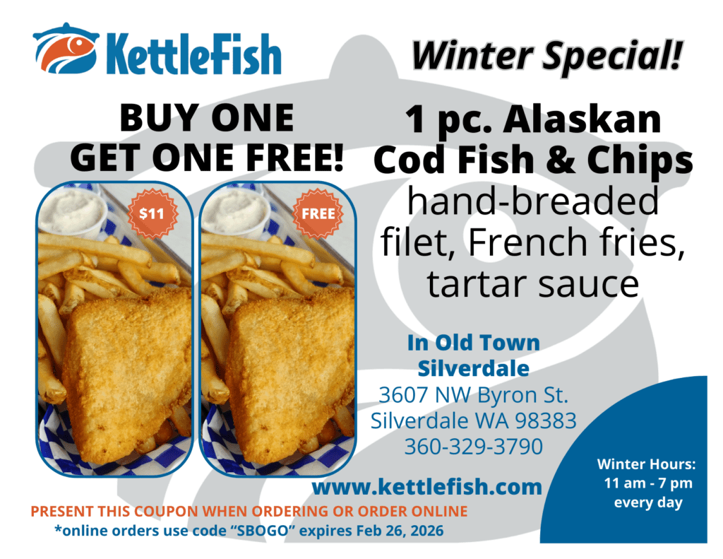 It’s cold out… but your wallet just got warmer! 🔥KettleFish Winter BOGO is HERE → Buy 1 Alaskan Cod Fish & Chips, Get 1 FREE ($11 for both!)Hand-breaded, crispy, perfect.Old Town Silverdale · Code SBOGO online · Ends Feb 26Tag the friend you’re splitting this…